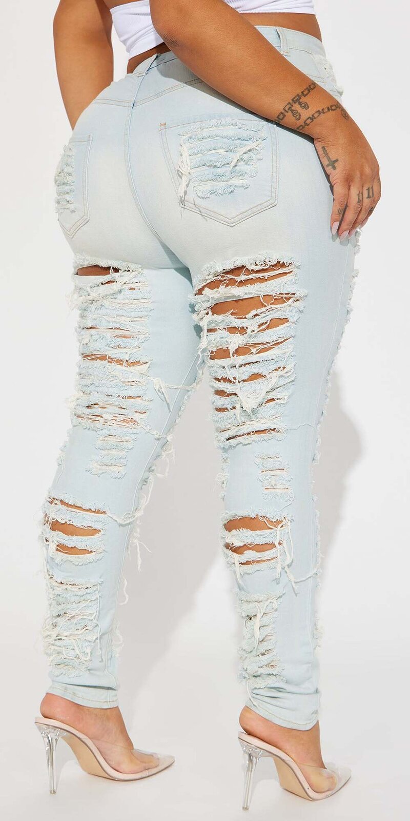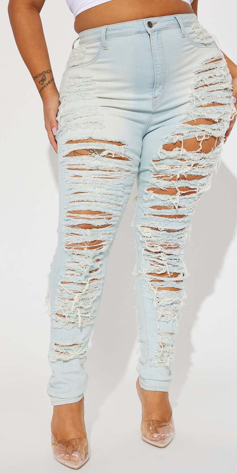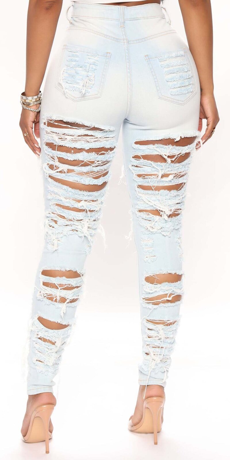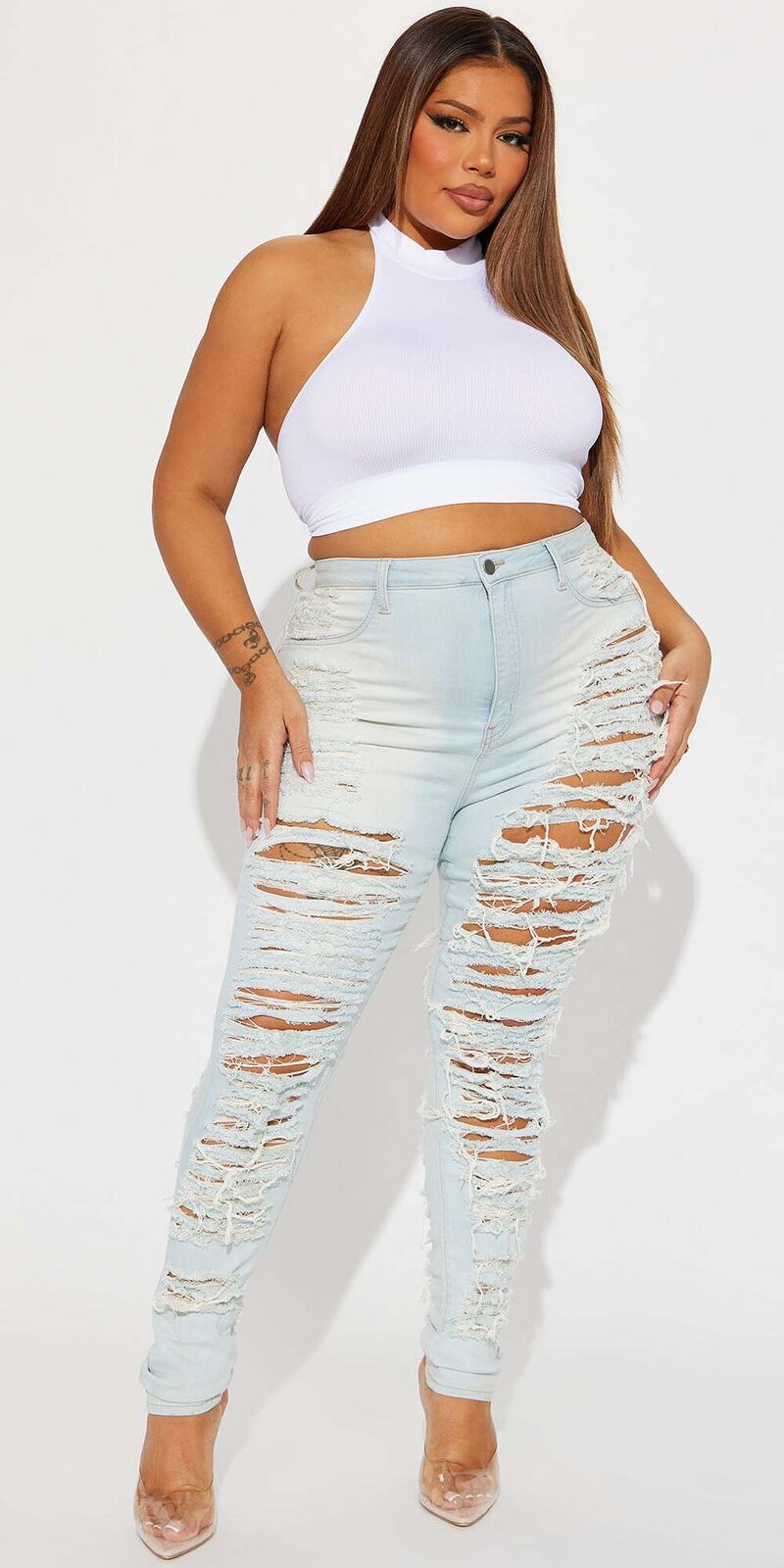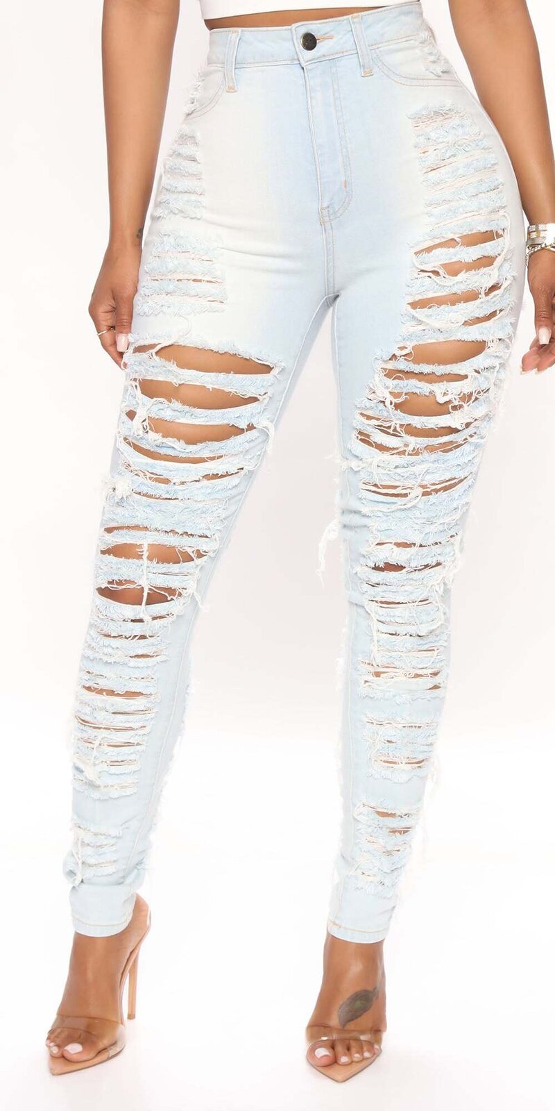 Svetlomodré skinny rifle s roztrhaným efektom predstavujú ideálny základ moderného šatníka. Vďaka vysokému pásu pôsobia lichotivo a opticky predlžujú nohy.