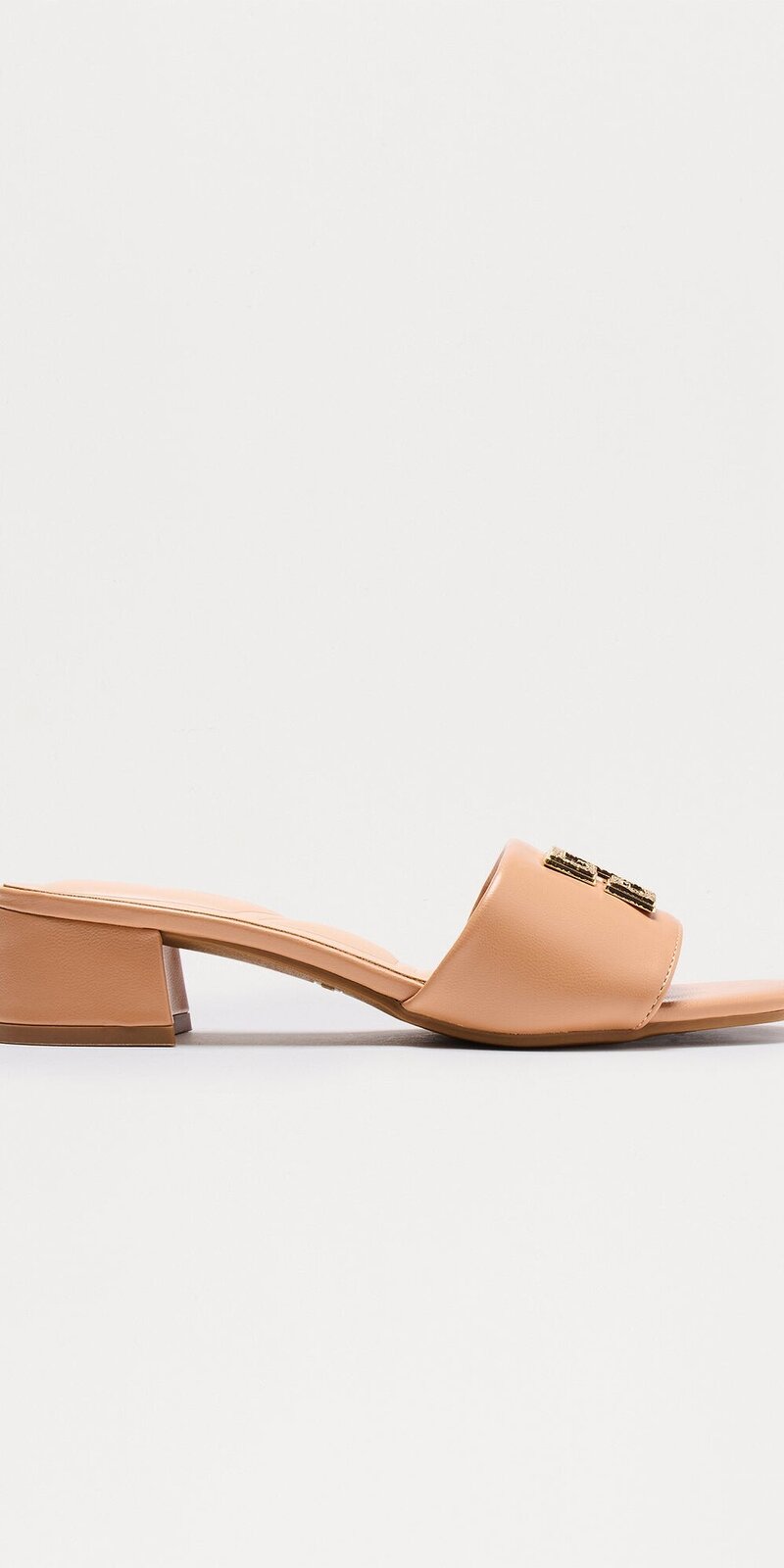 Štýlové mule sandále v hnedej farbe pôsobia moderne a sofistikovane vďaka čistej línii, štvorcovej špičke a výraznému kovovému detailu. Hladký povrch s koženým efektom je príjemný na dotyk a nízky stabilný podpätok zabezpečuje komfort aj pri dlhšom nosení.