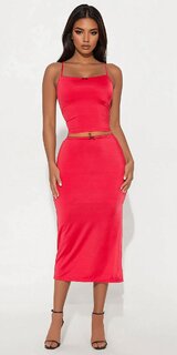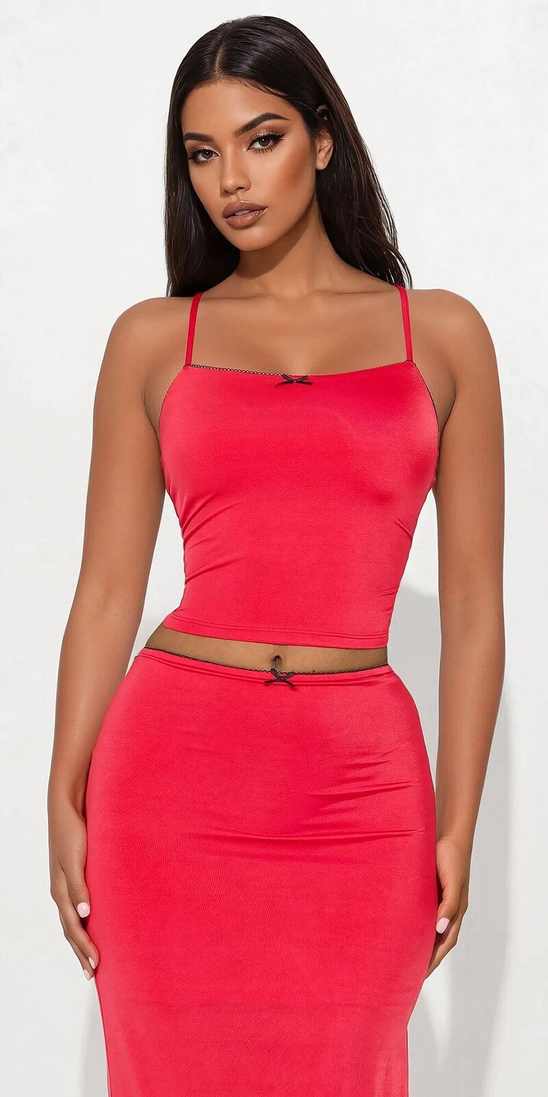 Elegantná červená súprava pozostávajúca z priliehavého crop topu a dlhej maxi sukne. Mašľový detail dodáva modelu ženský šarm, zatiaľ čo elastický materiál krásne tvaruje postavu. Podšívka zabezpečuje pohodlie a hladký vzhľad.