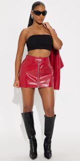 Výrazná mini sukňa v červenej farbe pôsobí odvážne a luxusne vďaka hladkému povrchu s koženým efektom. Pevnejší, nepružný materiál má elegantný lesk, je príjemný na dotyk a dokonale drží tvar, čím zvýrazňuje ženskú siluetu.