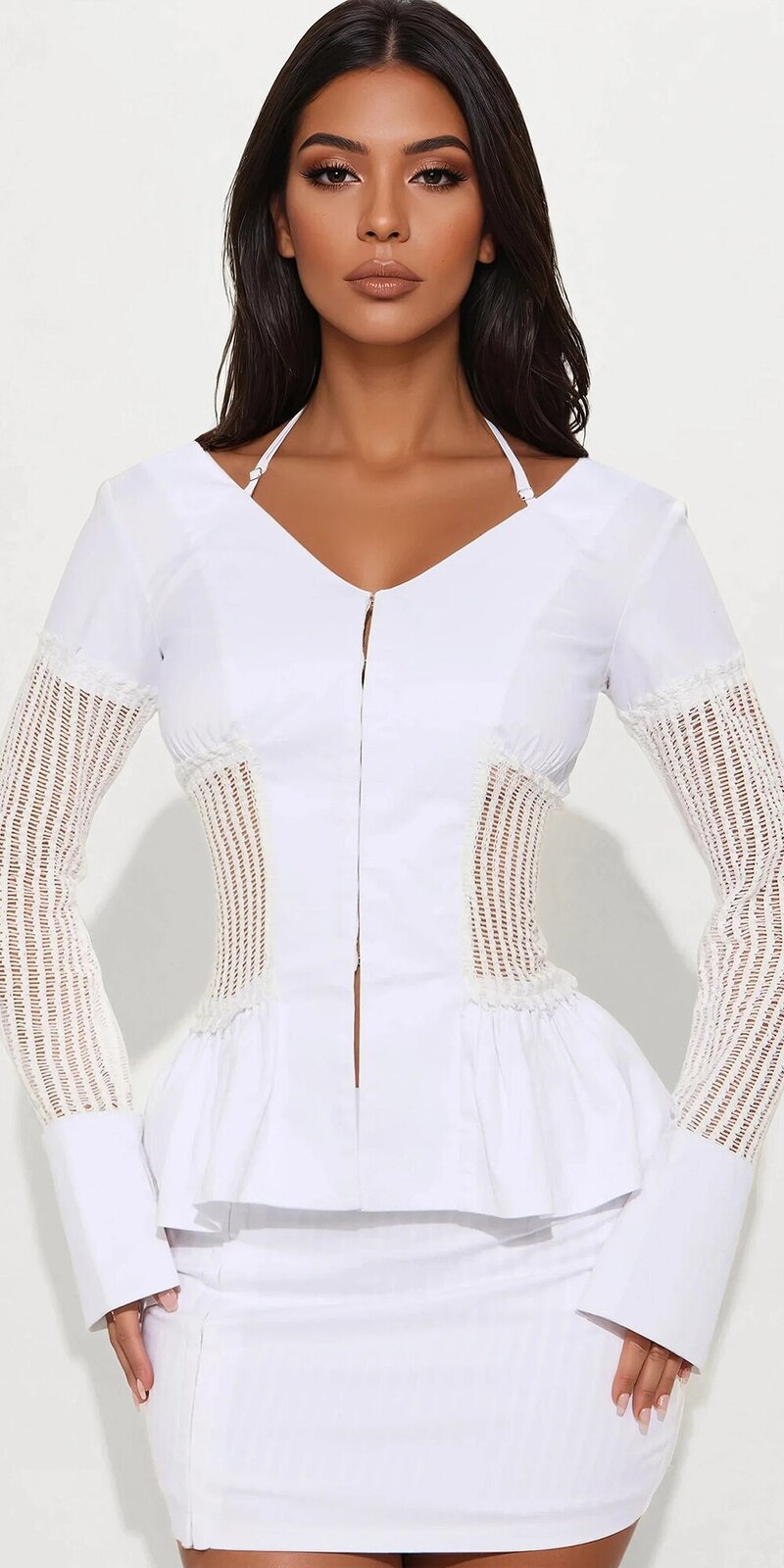 Elegantný set v bielej farbe pozostáva z topu a mini sukne s výrazným háčkovaným detailom v páse a na rukávoch. Pevnejší bavlnený materiál je príjemný na dotyk, drží tvar a vďaka podšívke pôsobí komfortne a upravene.