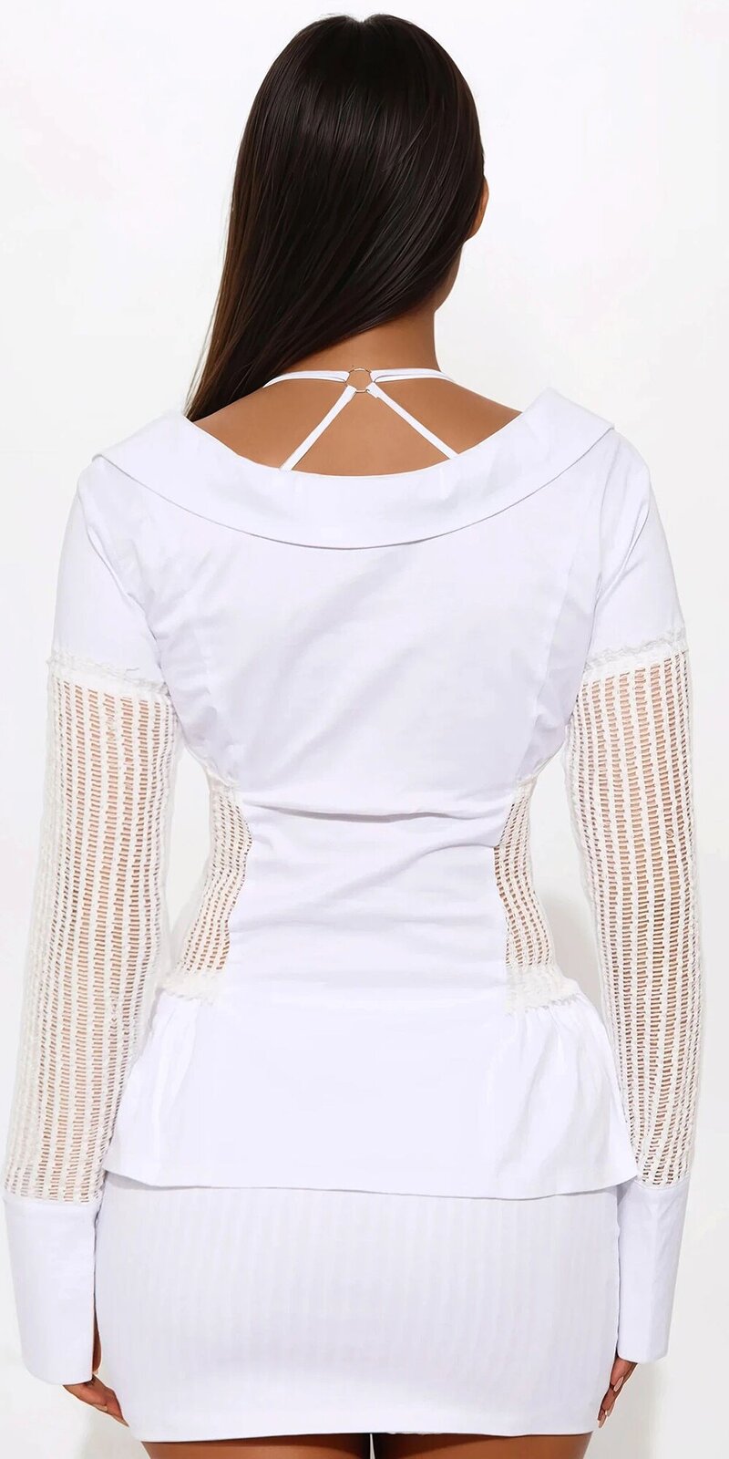 Tento biely set topu a mini sukne je dokonalou kombináciou romantiky a moderného štýlu. Háčkované detaily dodávajú modelu jemný, ženský akcent a vytvárajú sofistikovaný kontrast k hladkému materiálu.