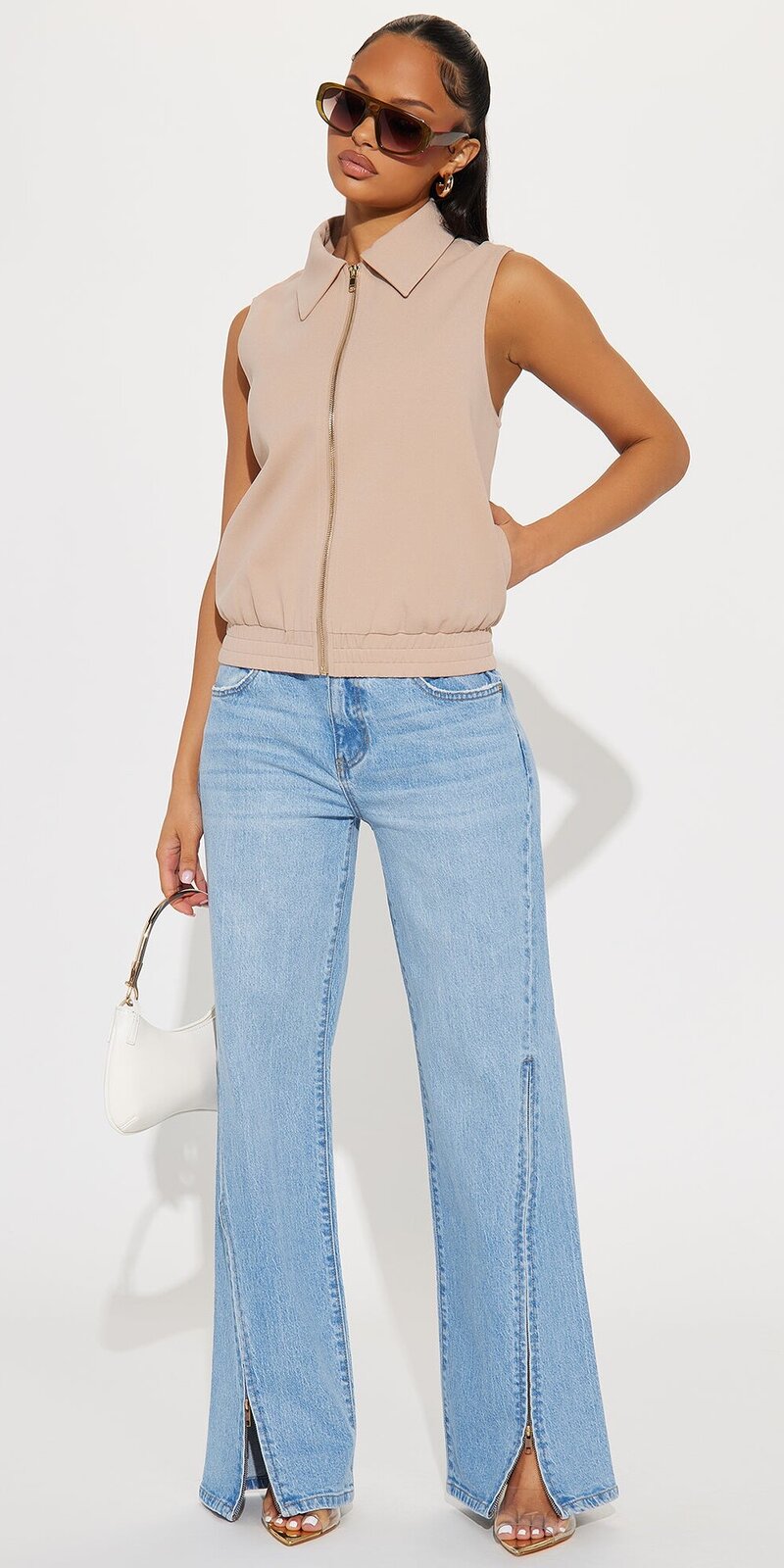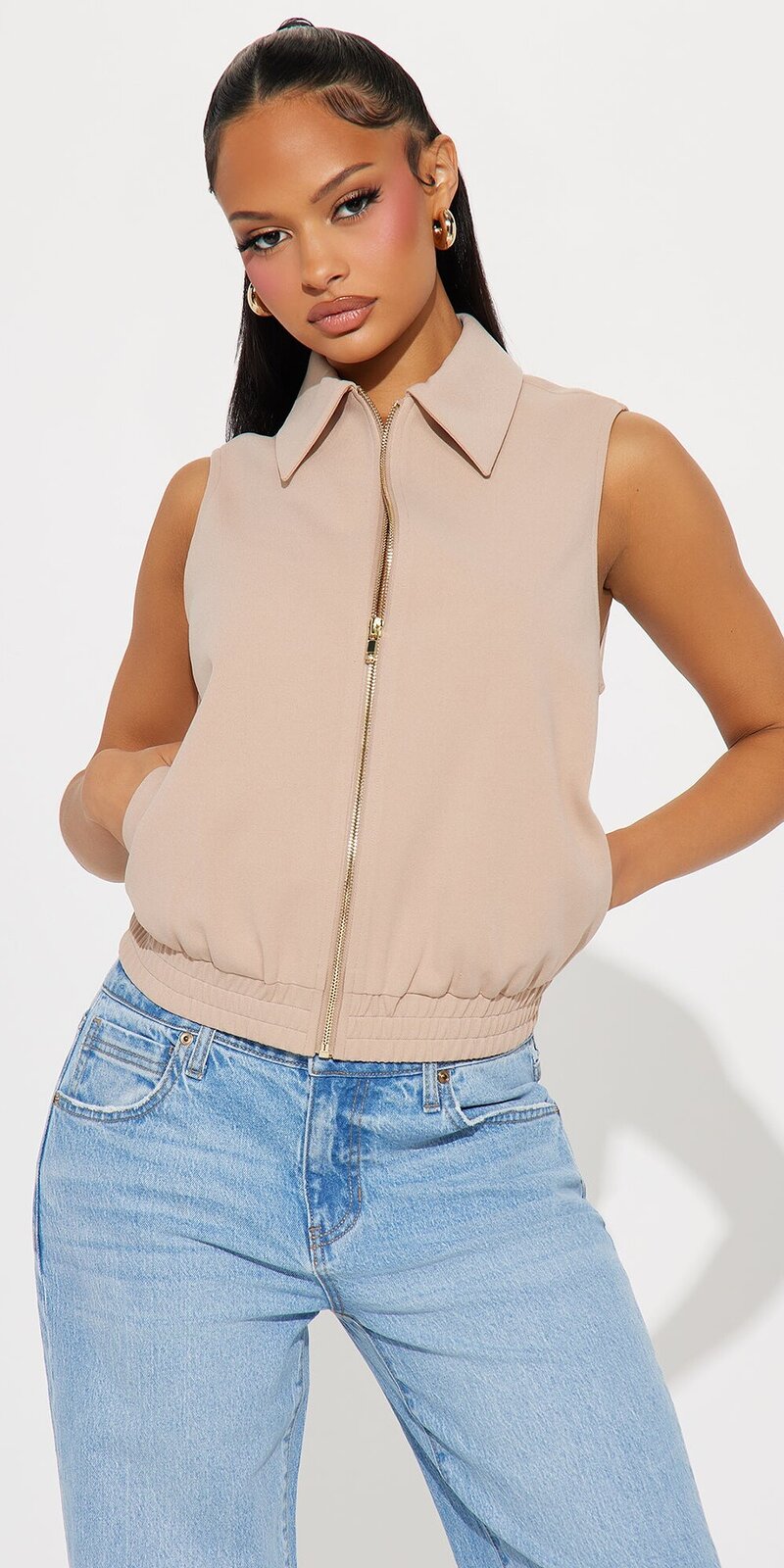 Béžová elegantná vesta so zipsom a golierom
