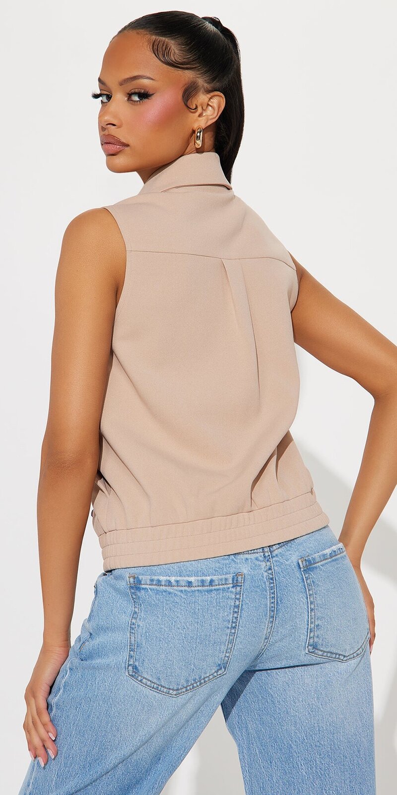 Táto béžová elegantná vesta je dokonalým doplnkom pre moderný vrstvený outfit. Vyrobená z jemne štruktúrovaného crepe materiálu s decentným leskom, vďaka čomu pôsobí sofistikovane a nadčasovo.